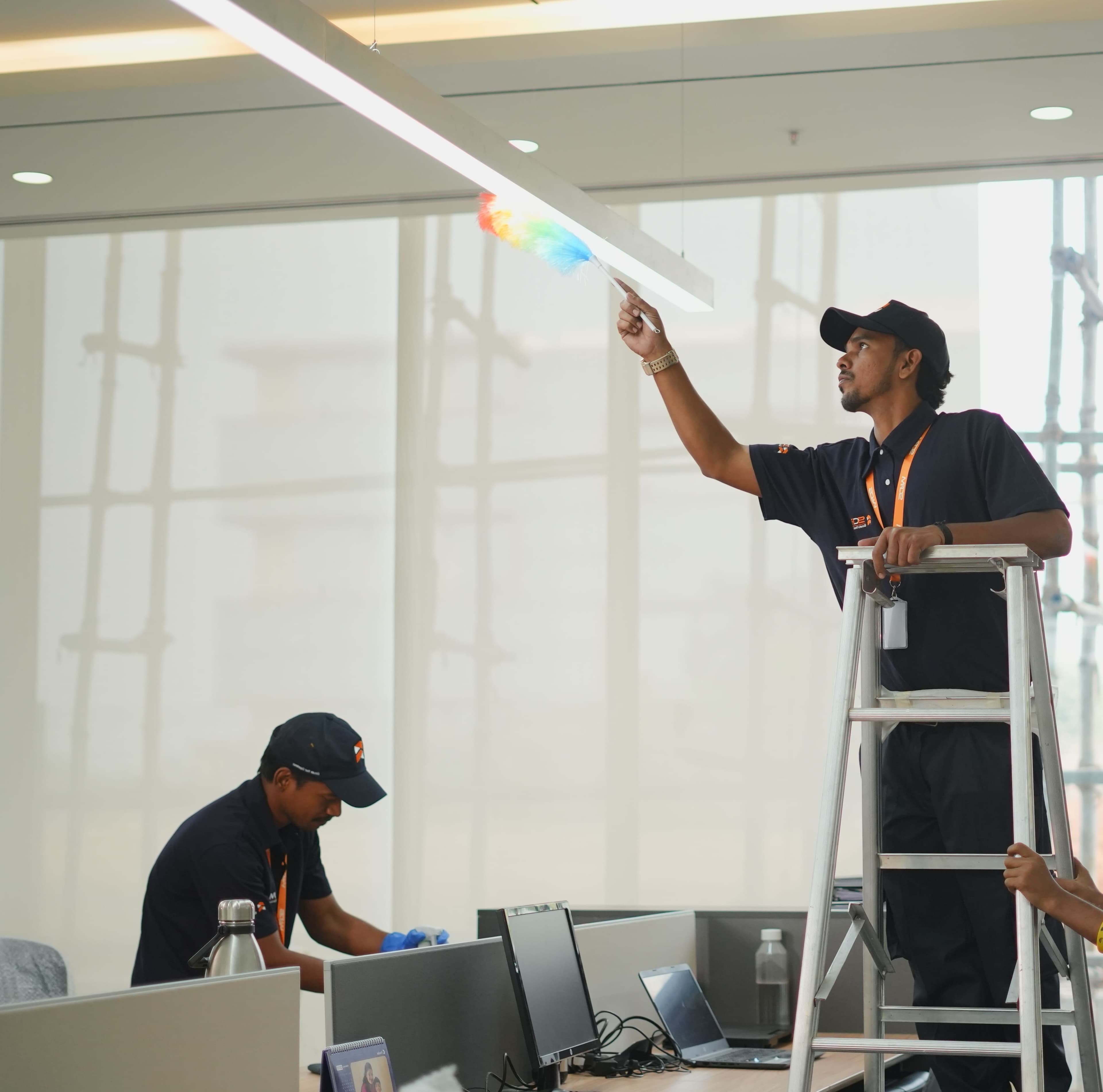 Ceiling tiles, light fittings, high shelving, exposed beams, ducts, and high-level ledges cleaned using appropriate access equipment. Dust and cobweb accumulation removed from areas unreachable in daily cleaning cycles.